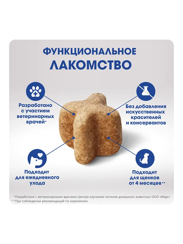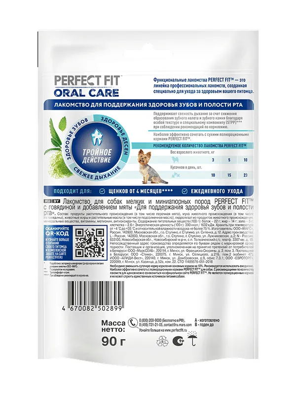Функциональное лакомство PERFECT FIT™ ORAL CARE подходит для щенков от 4 месяцев и стерилизованных собак. В основе рецептуры функционального лакомства PERFECT FIT™ ORAL CARE лежит особая формула, разработанная совместно с ветеринарными врачами Центра изучения питания домашних животных ООО «Марс».